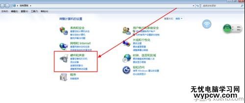 在控制面板頁面中,找到硬件和聲音欄目,點擊進入硬件和聲音的設置頁面。