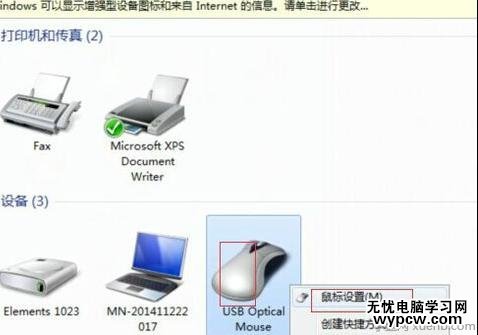 4.在“設備和打印機”中用鼠標右鍵單擊“鼠標”選項里的“設置鼠標”。