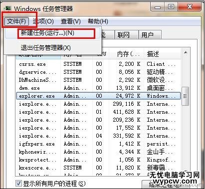 2、選中“explorer”進程,單擊右鍵選擇結束進程,在windows任務管理器中找到“文件”,選擇文件下面的“新建任務”;