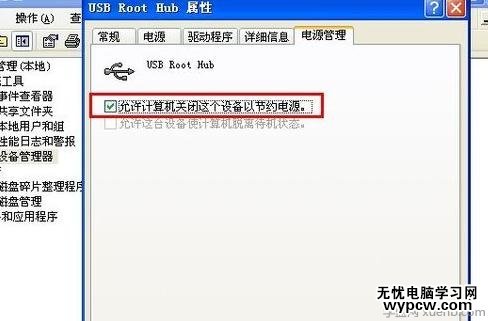 我們右擊它然后選項(xiàng)屬性選項(xiàng),找到電源管理選項(xiàng),默認(rèn)的是勾選“允許計(jì)算機(jī)關(guān)閉這個(gè)設(shè)備以節(jié)約電源”這個(gè)選項(xiàng),我們把它去掉,然后對(duì)于每一個(gè)USB Root Hub都進(jìn)行相同的設(shè)置即可(因?yàn)槟悴恢滥莻€(gè)選項(xiàng)對(duì)應(yīng)那個(gè)接口)。