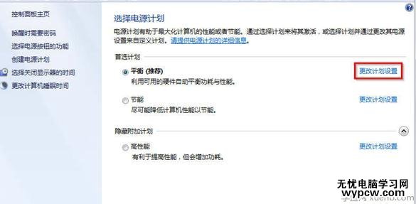 2、在“電源選項”中,我們點擊“平衡”右側的“更改計劃設置”。