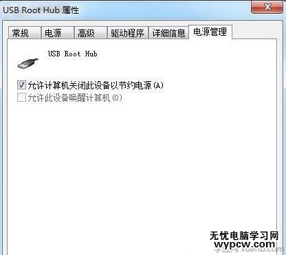 3、雙擊USB Root Hub選項(xiàng),在打開(kāi)屬性對(duì)話框,切換到“電源管理”,將“允許計(jì)算機(jī)關(guān)閉這個(gè)設(shè)備以節(jié)約電源”選項(xiàng)取消后按“確定”按鈕即可;如下圖所示: