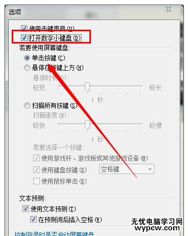 在打開的對話框中,勾選打開數字小鍵盤,然后確定。