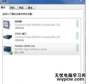 繼續點聲音設備。默認的選項是“揚聲器”,用鼠標選中最下面的“NVIDIA HDMI Out”,并點最下面的“設為默認值”。