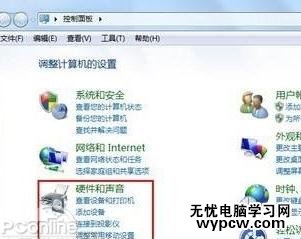 經過以上設置,顯示器已成功切換到液晶電視。如果沒有聲音,下一步就需要設置高清音頻設備了。點開始,進入控制面板,再點“硬件和聲音”。