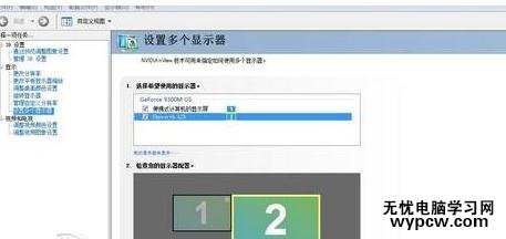 在筆記本桌面點右鍵,進入NVDIA控制面板。在右邊選擇顯示菜單,選擇“設置多個顯示器”,打開新的設置對話框。