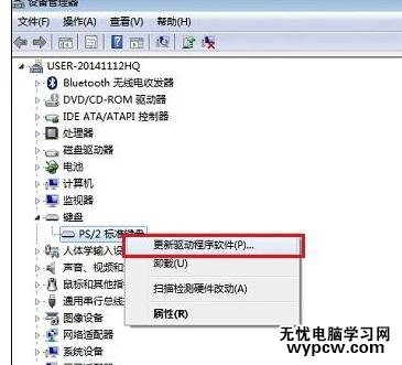 打開筆記本設備管理器之后,找到【鍵盤】,點擊展開,然后在【ps/2標準鍵盤】上右鍵鼠標,然后選擇【更新驅動程序軟件】,如下示意圖所示。