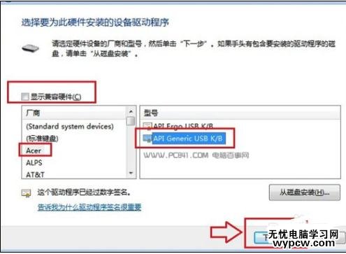 下面的這步“選擇要為此硬件安裝的設備驅動程序”設置非常重要,首先要將【顯示兼容硬件】前面的勾去掉,然后在廠商里,任意選擇一個其他筆記本品牌,比如筆者用的是聯(lián)想筆記本,在這里我們故意選擇“宏碁(Acer)”廠商,然后在右側的型號里,任意選擇一個,完成后點擊下面的【下一步】,如下圖所示。