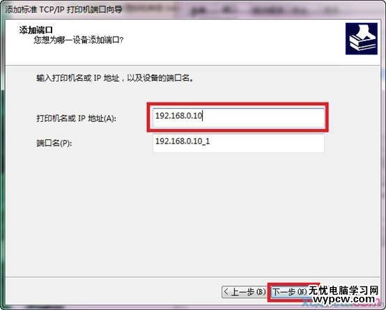 5.輸入您打印服務(wù)器的IP地址,點(diǎn)擊下一步。