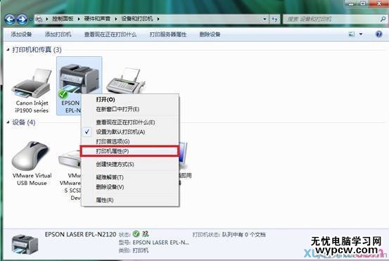 2.找到您安裝的打印機(jī)的圖標(biāo),右鍵,點(diǎn)擊打印機(jī)屬性。