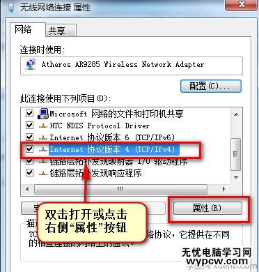 第四步、 在“無線網絡連接”右擊選擇屬性,在彈出界面點擊“inte.net協議版本4(TCP/IPv4)”,雙擊此項目或點擊“屬性”按鈕;