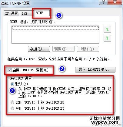 第六步、點擊“WINS”選項卡,勾選“LMHOSTS查找”,并將“NetBios”設置為“默認”或“啟用 TCP/IP 上的NetBIOS”;