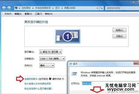 7、也可以在運行中輸入:desk.cpl →確定,打開控制面板→顯示→分辨率→連接到投影儀。