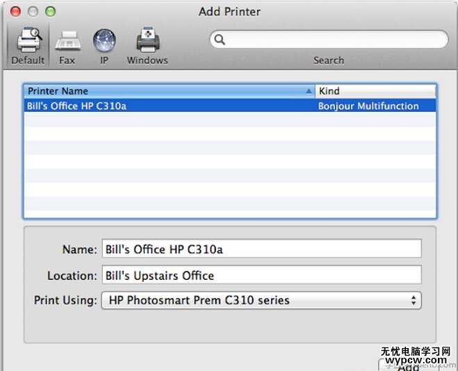 默認 – 使用此選項可顯示您的 Mac 已發現的通過 USB、網絡連接或其他方法連接到電腦的所有打印機的列表。選擇您在此處看到的打印機,然后點按“添加”。如果打印機的列表過長,可使用右上方的搜索欄搜索您想要的打印機。
