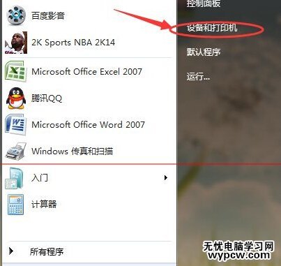 3、點擊開始菜單之后,彈出窗口會顯示很多選項,我們點擊設備和打印機選項