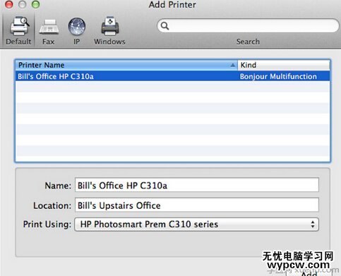 默認 – 使用此選項可顯示您的 Mac 已發現的通過 USB、網絡連接或其他方法連接到電腦的所有打印機的列表。選擇您在此處看到的打印機,然后點按“添加”。如果打印機的列表過長,可使用右上方的搜索欄搜索您想要的打印機。