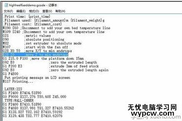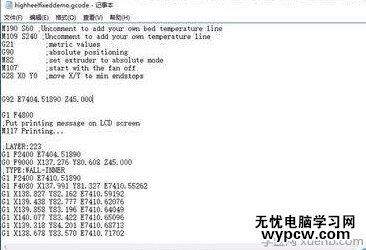 4、先另存文件,否則原來的G代碼就改了,從“layer223”以上的內容刪去,上限見圖,基本是LCD顯示狀態的語句之下,我用的cura切片軟件,其他軟件類似,注意不要刪掉啟動代碼,一會兒要改