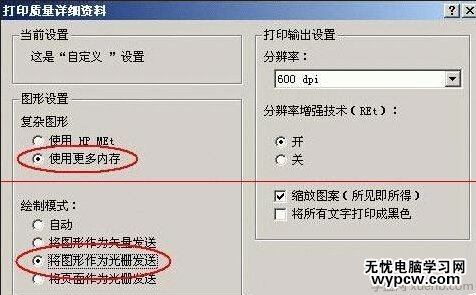 5、將“使用更多內存”和“將圖形作為光柵發送”選中,確定打印。