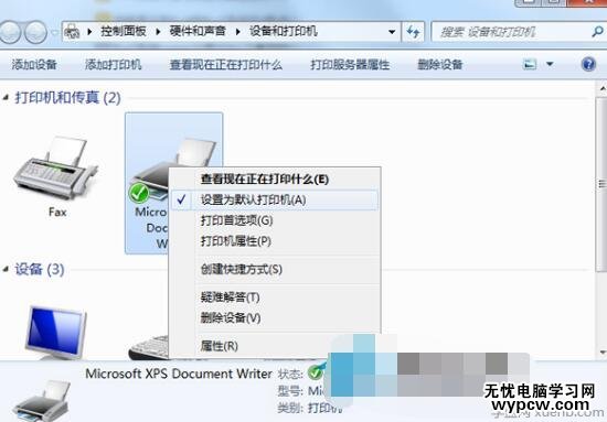 2、選擇你要設置為默認的打印機,右鍵點擊,在菜單中選擇“設為默認打印機”即可。