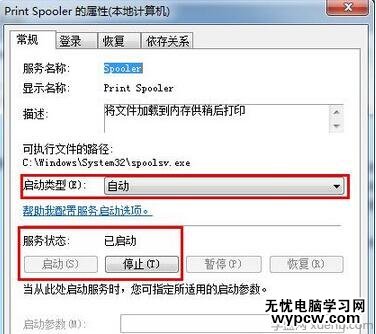 7、在彈出的Print Spooler屬性設置窗口中,將啟動類型設置為“自動”,然后點擊下面的“啟動”按鈕,如果此時已經處于已啟動狀態,那就先停止再啟動,隨后點擊“確定”按鈕保存,如下圖所示: