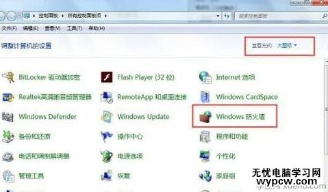 2、在控制面板窗口中,修改查看方式為“大圖標”方式,然后在窗口中找到“windows防火墻”并點擊;