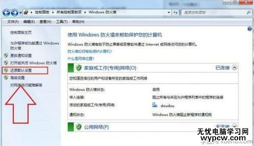 3、在Windows防火墻窗口左側(cè)菜單中選擇“還原默認設(shè)置”,然后在跳出的窗口中繼續(xù)選擇還原默認設(shè)置,完成防火墻還原設(shè)置后即可。