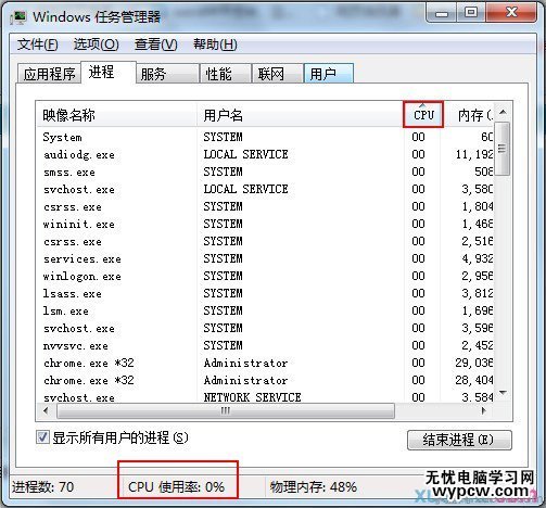 首先我們打開任務管理器,然后切換到cpu行列,對占用cpu的出程序逐一排查,查看哪個cpu程序占用的cpu忽高忽低的情況。找到占用cpu不穩定的進程將其結束掉(不是系統進程的前提下),如果發現時系統進程不能結束的話,那就系統的問題了。