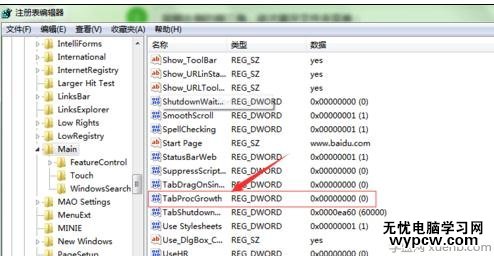 選中”Main“右側(cè)會(huì)顯示子內(nèi)容。從中找到”TabProcGrowth“,并雙擊打開,將數(shù)值數(shù)據(jù)設(shè)置為”0“或者”1“。TabProcGrowth賦值為1,則表示允許系統(tǒng)最多可允許IE出現(xiàn)兩個(gè)進(jìn)程,如果賦值為0,則表示IE只能有一個(gè)進(jìn)程。一般我們?cè)O(shè)置為”0“。