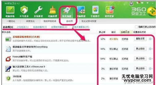 當(dāng)然,也可以使用第三方軟件來(lái)處理,如圖,打開(kāi)360衛(wèi)士,優(yōu)化加速——》啟動(dòng)項(xiàng),逐一選擇禁止啟動(dòng)即可。如圖。