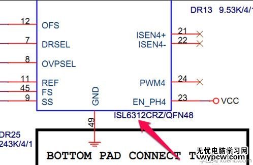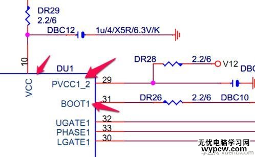 根據CPU電源管理芯片的引腳定義測量芯片上的VCC,PVCC,BOOT腳的電壓是否為12V,12V,5V,若有,為正常,若無,測需要檢測與之相連的元件,供電腳上的限流電阻,電容和二極管是否正常.