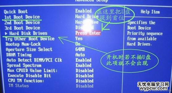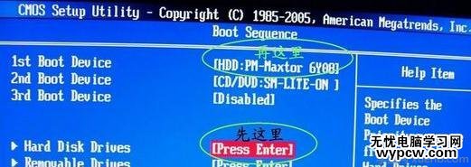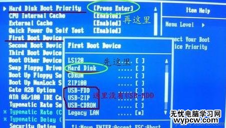 D、更常見的新情況是,bios中根本不出現類似USB-???的項目,這是主板把U盤當硬盤對待,設置U盤啟動大多涉及兩個菜單項目,名稱基本上就是“1st boot device”、“boot sequece”、“Hard disk boot priority”之類。設置思路基本就是先把硬盤設為第一啟動設備,再到硬盤選擇項目中把U盤提到首位。提供幾個圖片供大家參考,AWARD和AMI都有,大同小異: