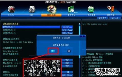 8,最后的工作就是要保存設(shè)置了,你可以到主界面的“儲存并離開”的選項下面去設(shè)置保存,還有一個更直接的方法是,直接按F10,就可以快捷地進行保存并退出,這兩項功能都是一樣的,在彈出的窗口中按“是”,這樣,UEFI設(shè)置從U盤或光盤的啟動方法就完成了。