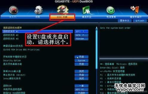 5,然后用左右方向鍵,移到"BIOS功能"這一項來, 我們要在這個選項下面進行U盤或光盤的啟動設(shè)置。