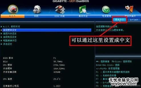4,由于UEFI是一種新BIOS,可以支持中文語言,這樣就大大方便對英文不太了解的人進行設(shè)置BIOS,在主界面右上角的位置有一個按鈕,英文為“Language”,點擊它,打開一個窗口,選擇里面的“簡體中文”,主界面就變成中文的了。