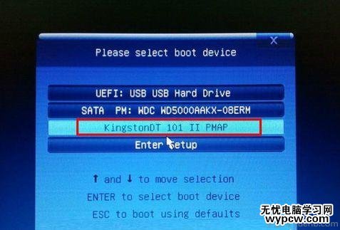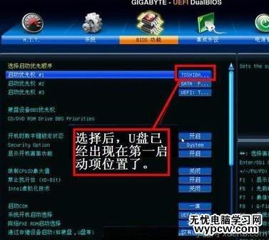 7,當(dāng)按了Enter確定鍵之后,退出小窗口,U盤就已經(jīng)被選定成為了第一優(yōu)先啟動的項。如圖: