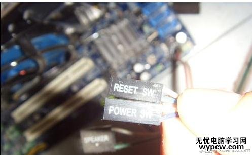 我們找到“RESET”線和“POWER”線,撥上來,如圖。主板上也會標明。有些主板的寫法可能和這有些不同,不過也差不多。