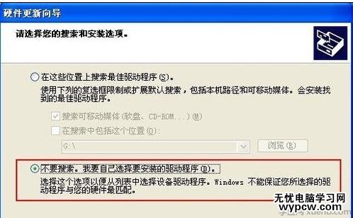 在出來的“硬件更新向導”對話框中,搜索軟件選擇“否,暫時不”然后點擊下一步,選擇“從列表或指定位置安裝”,接著選擇“不要搜索。我要自己選擇要安裝的驅動程序”