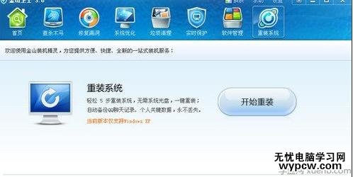 1.首先下載金山衛士,打開衛士主界面中“重裝系統”標簽,