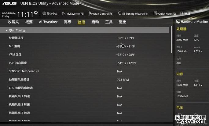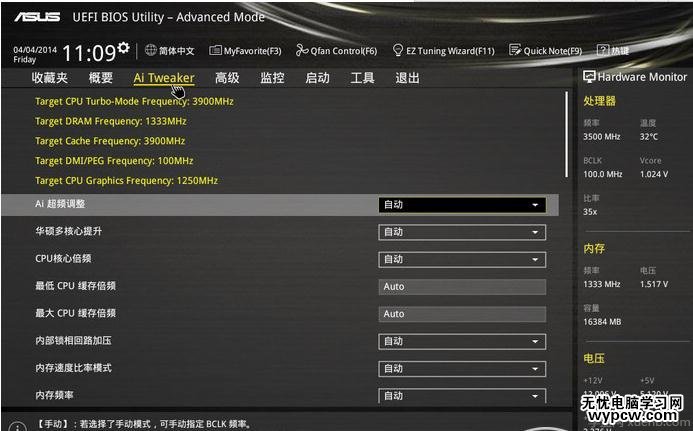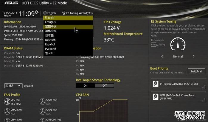 華碩Z97-Deluxe主板的BIOS主界面也是點綴以金色,默認啟動的還是EZ界面,可以按F7切換到高級模式做詳細設定。值得一提的是,華碩的BIOS選項切換做了類似手機那樣的動畫效果,頁面切換有那種左右平移的效果,操作起來非常流暢的感覺。
