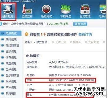步驟二、再打開魯大師,它會自動的檢測你電腦個硬件的型號。從上圖我們能清楚的看到電腦硬件配置的各項參數,這種方法也是比較好的一種查看主板型號的方法。而且比較簡單,如圖所示: