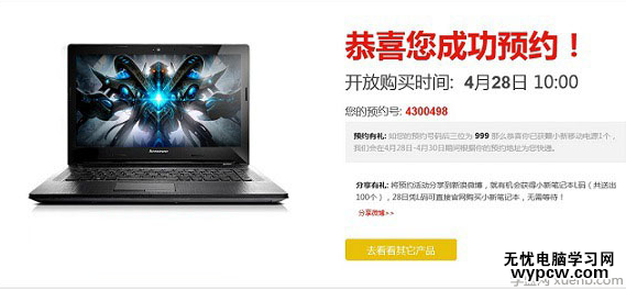 最后就可以看到預約成功的提示了,聯想小心筆記本將于4月28日10:00開放購買。