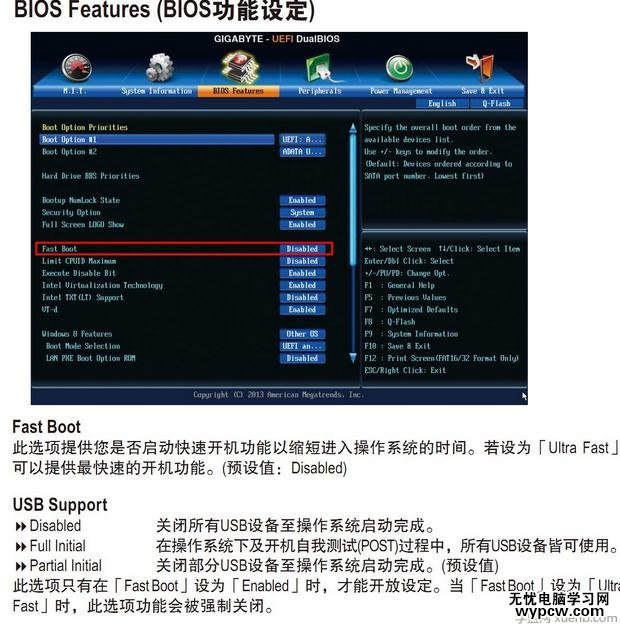 (1)在BIOS的BIOS Features (BIOS功能設定)中,把Fast Boot設置為:Enabled(啟用);