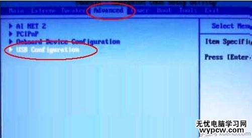 3、進(jìn)入BIOS后,找到“Advanced”選項(xiàng),最下面項(xiàng)是“USB Configuration”,用上下方向鍵選擇它,回車(chē)進(jìn)入,如下圖所示;