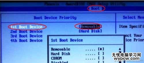 6、然后在“Boot Devicepriority”設(shè)置界面下選擇第一項(xiàng)“1st Boot Device”并按回車(chē)。然后在彈出的“1st Boot Device”選項(xiàng)中選擇第一項(xiàng)“Removable”(移動(dòng)裝置),如下圖所示;