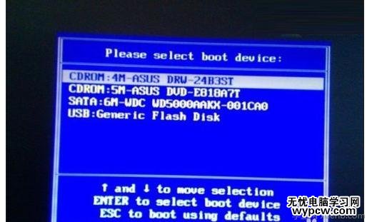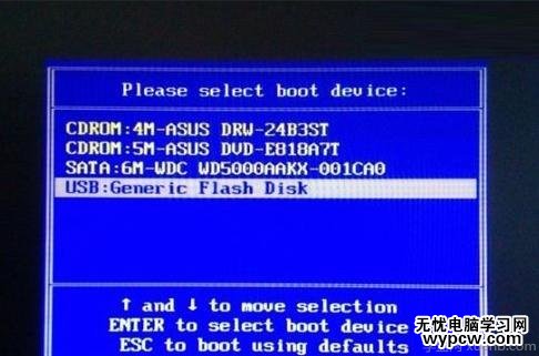 大家看下圖,將光標移動選擇到的地方顯示“USB:Gener ic Flash Disk”(小編寫這篇教程的時候使用的是u盤)所以,當我們按下快速熱鍵F8的時候顯示出來的選項中就包含有小編用u啟動制作好啟動盤的u盤。
