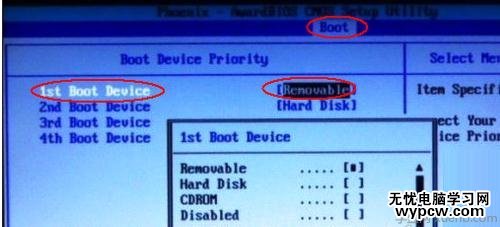 然后在“Boot Devicepriority”設置界面下選擇第一項“1st Boot Device”并按回車。然后在彈出的“1st Boot Device”選項中選擇第一項“Removable”(移動裝置):