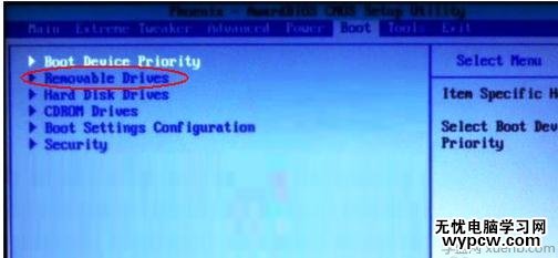 接下來按ESC取消鍵,返回上一級設置界面,按上下方向鍵,選擇第二行的“Removeable Drives”項,并按回車進入: