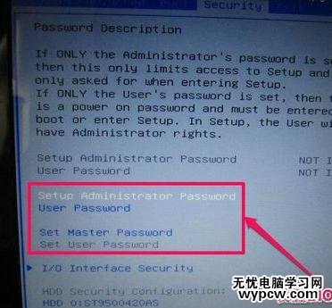 7,主界面的Secunity這一項,其意思為安全選項,主要設置BIOS密碼,如果是個人電腦,沒有必要設置密碼。