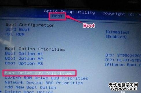 如果要設置啟動,選擇Hard Drive BBS Priorities這一項,這是硬盤選擇項,有的電腦上有幾塊硬盤,需要選擇其中一塊,U盤也被認為是硬盤的一種,如果用U盤啟動,也先要進入此項選擇。
