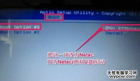 6,進入后,會顯示硬盤啟動項,我的電腦有兩選項,一個為:PO:ST9S.....這個是我的硬盤,另一個為?a href=http://www.xuenb.com/web/aspx/ target=_blank class="infotextkey">.netac,這個是我的朗科U盤。注意,必須先把U盤插上才會顯示。如果要設置U盤啟動,在Boot Option #1這一項按Enter進入,選擇Netac這第一啟動,然后按回車,當然最后一定要按F10進行保存,這樣才會生效,自動退出BIOS后,就會從U盤啟動。
